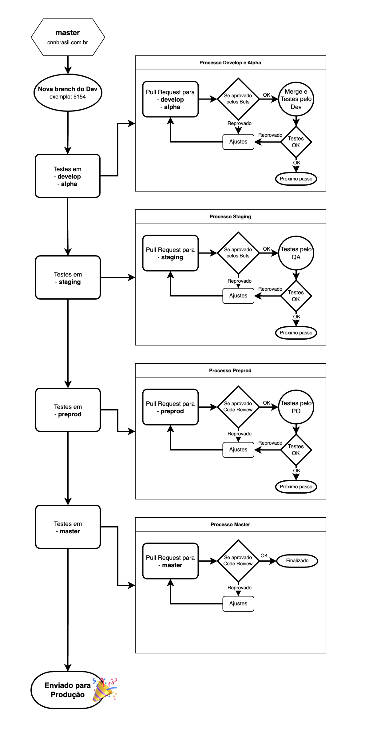 Nosso fluxo de trabalho Git é um pouco diferente do git-flow tradicional, especialmente quando se trata das branches dos ambientes de teste. Nossas branches de teste não são mescladas diretamente na branch ‘master’, pois são dinâmicas e estão em constante evolução com novos códigos.